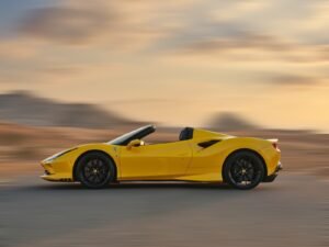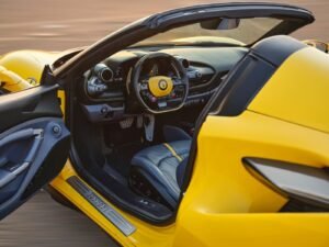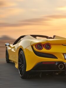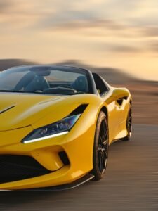 a 2022 Ferrari F8 Tributo Spyder finished in vibrant yellow with a mid‑mounted 3.9 L V8 engine producing 710 hp, achieving 0–100 km/h in 2.8 seconds. it has a 3902 cc displacement, rear‑wheel‑drive, automatic transmission, two doors, two seats and space for one hand luggage.
